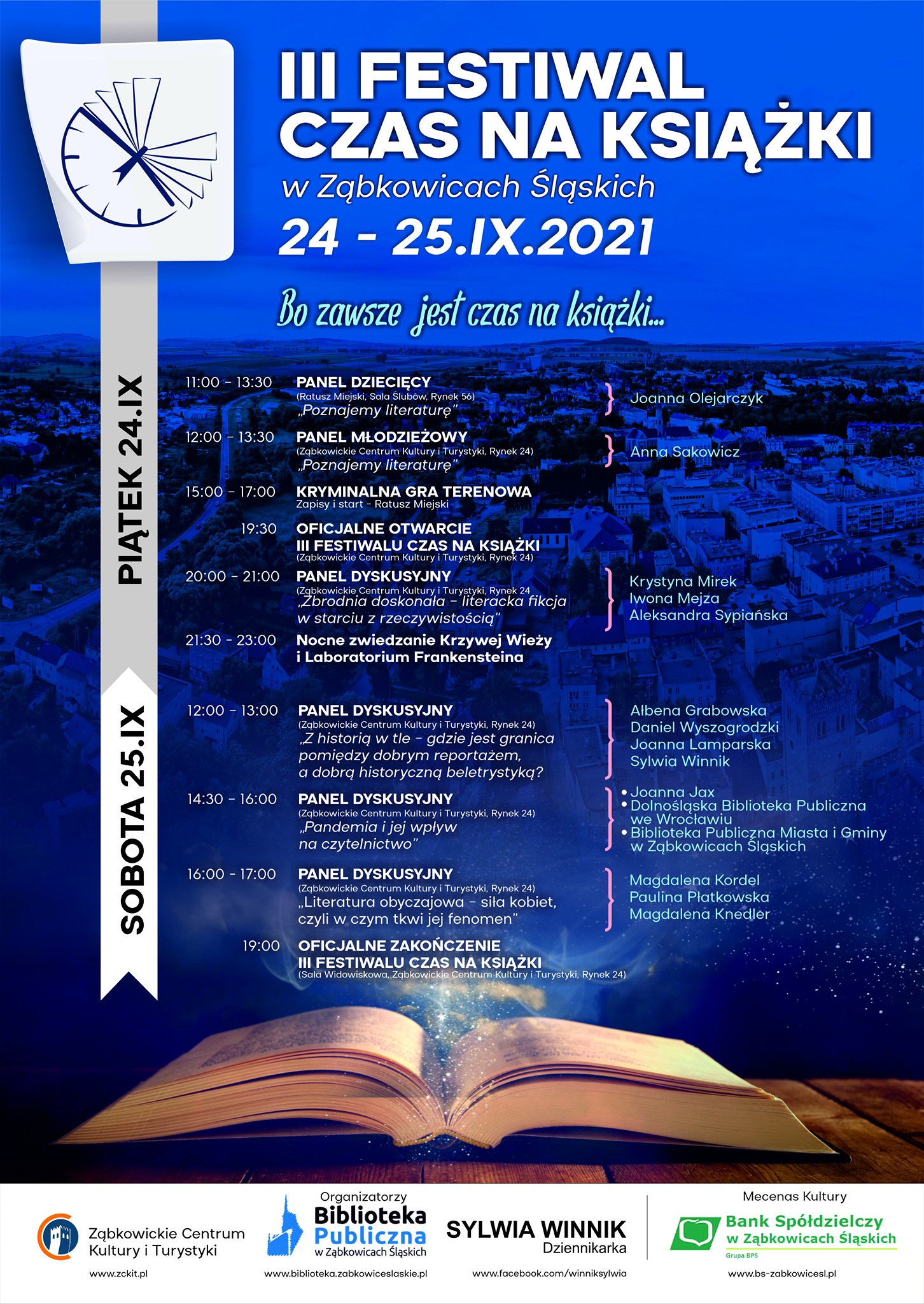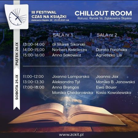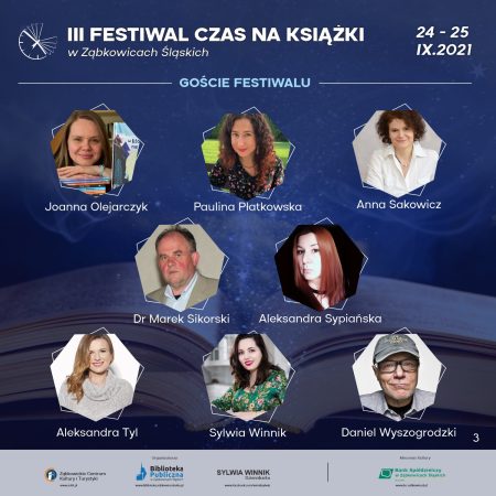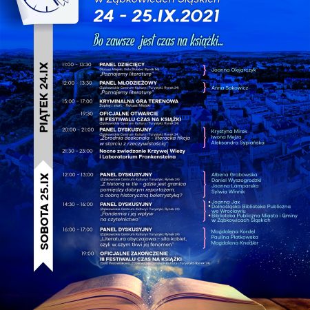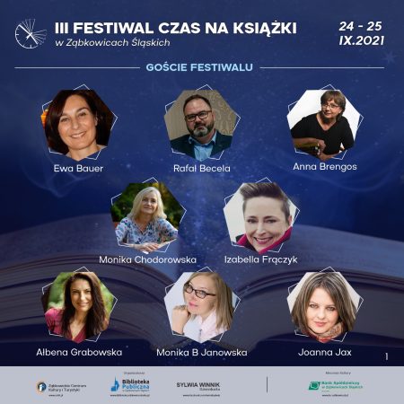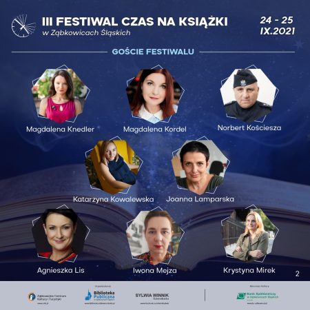 W dniach 24-25 września 2021 r. w Ząbkowicach Śląskich, po kilkuletniej przerwie, w tym wymuszonej pandemią, miało miejsce kolejne wielkie święto książek i ludzi z nimi związanych. Ogromnym nakładem pracy władz miasta i organizatorów przygotowano wiele spotkań poświęconych literaturze. Uczestniczyli w nich wszyscy – od warsztatów dziatwy szkolnej, po wizyty pań emerytek. Panele dyskusyjne, spotkania z autorami, gra terenowa, zwiedzanie atrakcji turystycznych Ząbkowic, możliwość zakupu książek z autografem i zrobienia sobie sweet-foci z ulubioną pisarką/pisarzem. Były też nagrody dla autorów honorujące ich dorobek i dla ambasadorów książek za ich wysiłek w krzewieniu czytelnictwa. A wszystko to w atmosferze życzliwości, serdeczności i uśmiechów. Festiwal został zwieńczony elegancką galą z werwą prowadzoną przez Jerzego Skoczylasa. „I ja tam byłem….” Bieżące relacje starałam się przekazać na gorąco za pośrednictwem Facebooka, więc zapraszam do odwiedzenia mojego profilu.