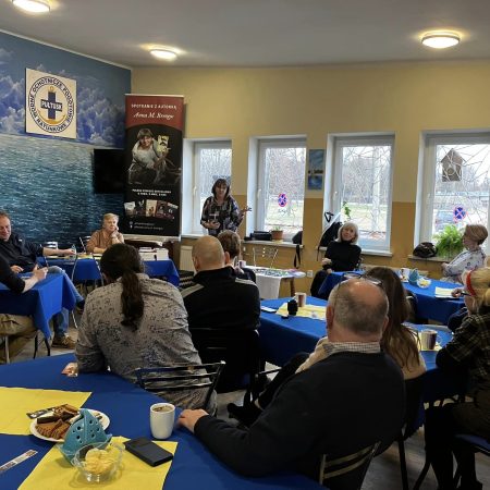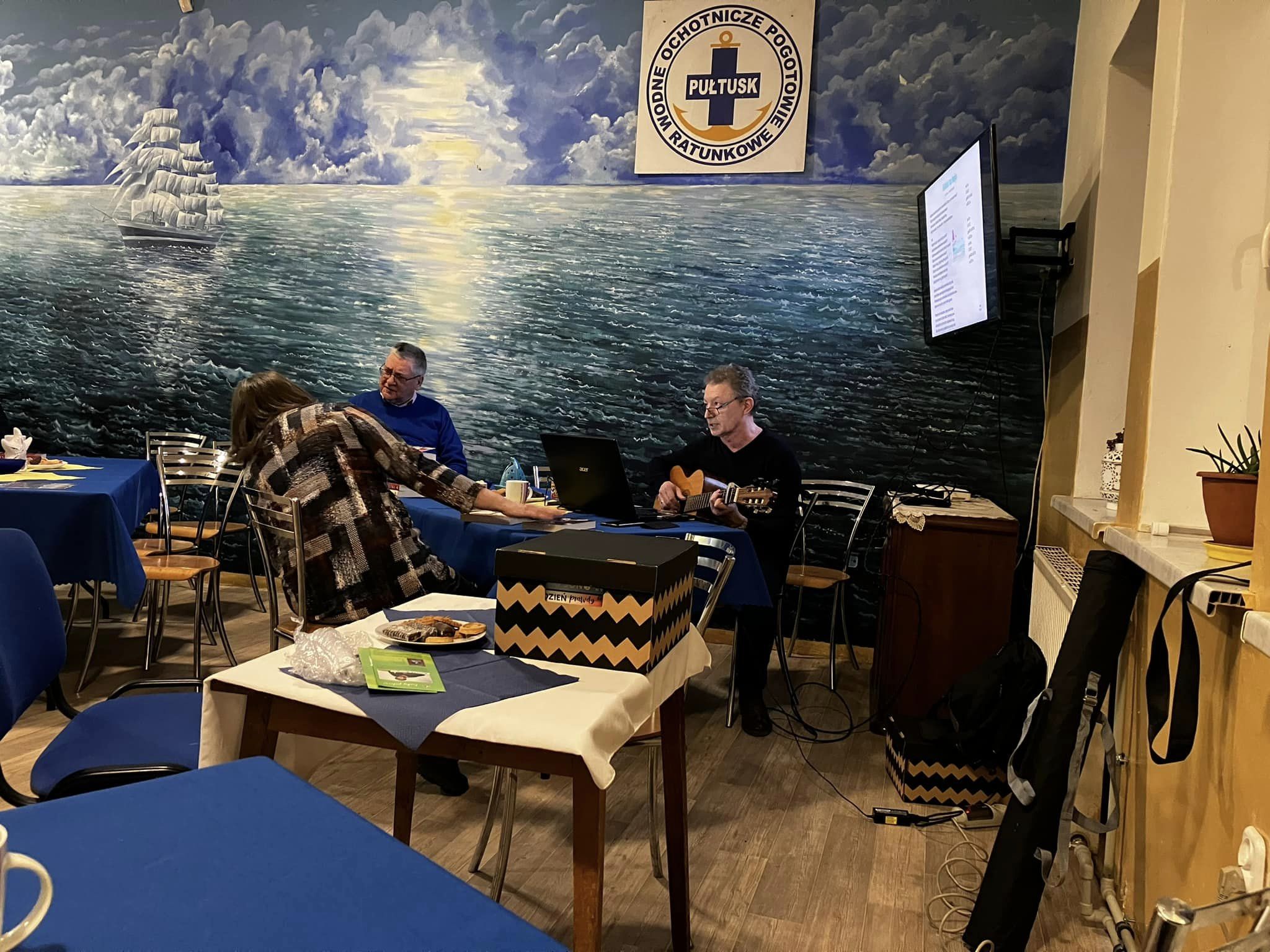 Tymczasem my w trakcie wizyty 18 marca 2023 r. wspominaliśmy nasze rejsy, nasze kursy i nasze przygody. Było o tym, jak wspólnymi siłami utopiliśmy sprzęt, jak wpadłam do wody w sztormiaku i jak spałyśmy w forpiku przykryte żaglem.